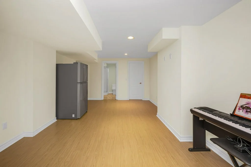 Carpet free lower level features a rec room with a bar, exercise area, and another gas fireplace.